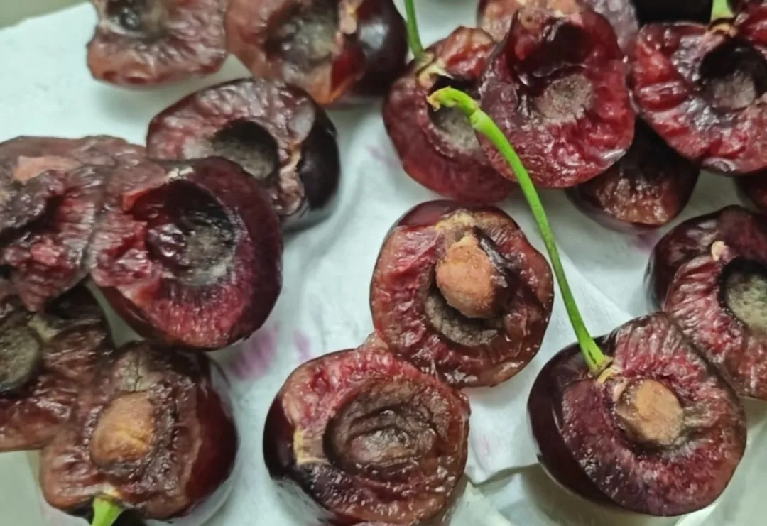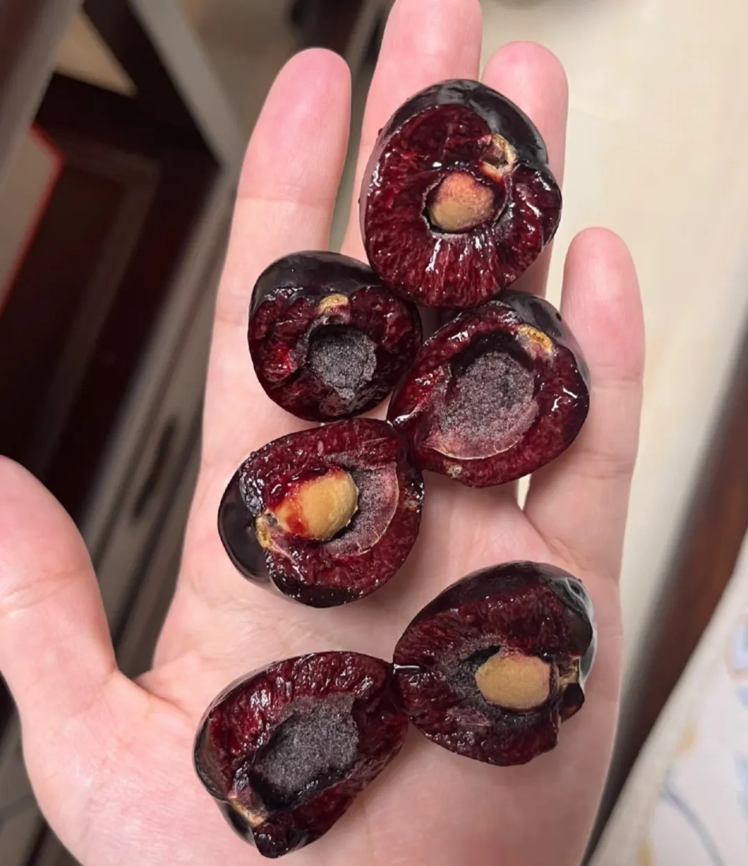 很遗憾,这种果肉变黑的车厘子,其实是发生了褐变,已经变质,提醒家人千万别吃!