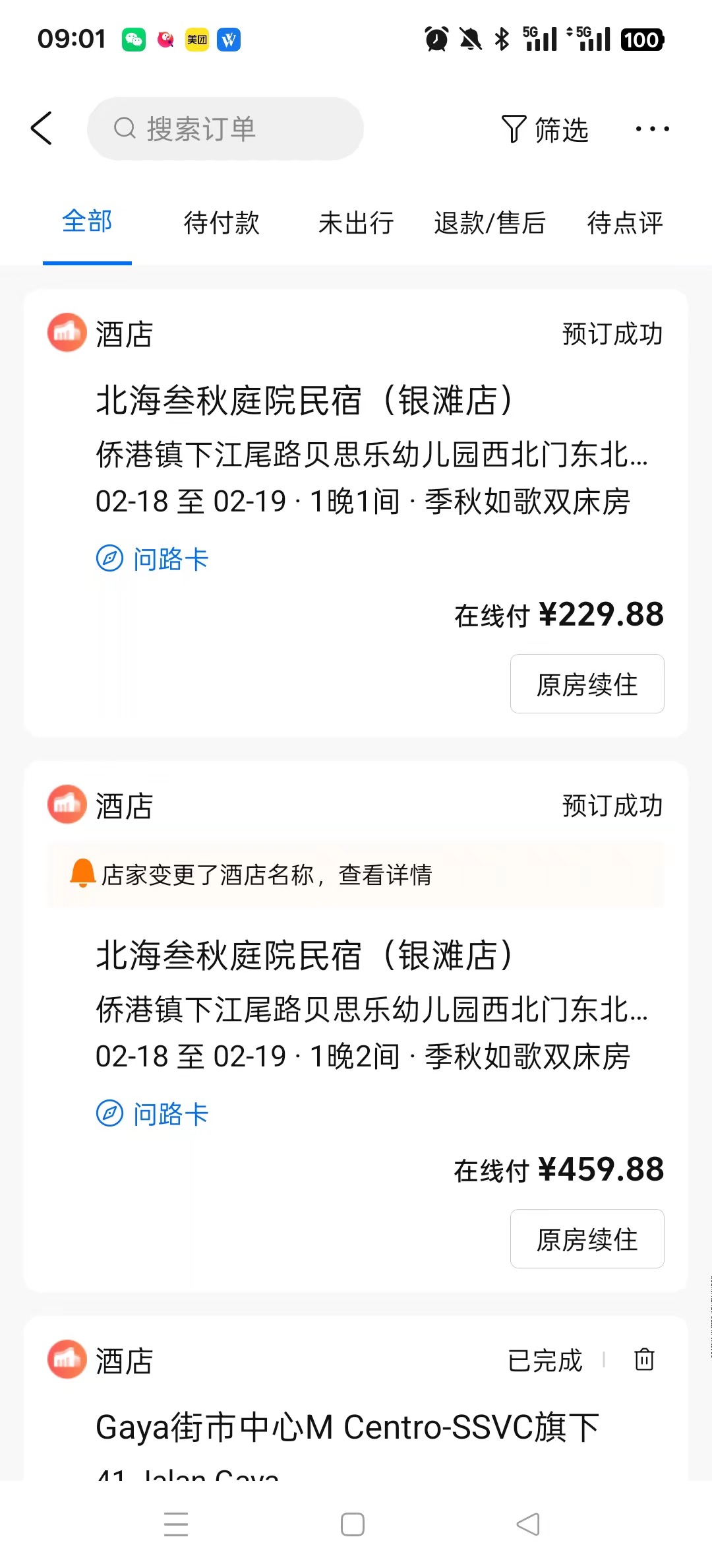 刘女士称,本准备是4名年轻人同行,就订了两间名为“季秋如歌”双床房,一晚单价230元,两间共460元。之后,又决定带上家里53岁的长辈和4个月大的小朋友一同出行,同样的房型,她又下单了一间。